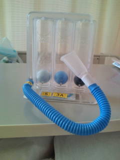 これは、術後の肺機能をより早く回復させるための、立派な(?)医療器具らしい。術前にこれで呼吸の練習をするんです。だから、吹くたびに「スピースピー」と音がする。しかも、なんとなく情けない音なんですね。おそらく、どこの病院でもやると思いますし、経験された方も多いのではないかと。